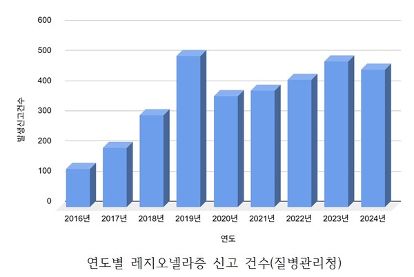 질병관리청의 감염병 감시 연보에 따르면, 국내 레지오넬라증 신고 건수는 지속적으로 증가하고 있다. 2010년대 초반 연간 30건 안팎에 불과했던 신고 건수는 2016년 128건으로 100건을 넘어선 이후, 최근에는 연간 300~500건 이상의 신고가 접수되고 있다. 이는 진단 기술(소변 항원 검사 등)의 보급 확대와 더불어 기후 변화로 인한 습도 상승, 대형 건축물의 노후화가 복합적으로 작용한 결과라고 볼 수 있다. 레지오넬라 폐렴의 경우 적절한 항생제 치료가 없을 시 치명률이 15~30%에 이르며, 특히 면역 저하자나 고령층이 밀집한 병원 및 요양 시설에서는 집단 감염 시 매우 위험한 상황을 초래한다.