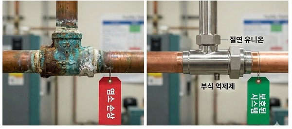 레지오넬라 사멸을 위한 고온 관리와 강력한 소독제 투입은 필연적으로 배관 부식을 유발한다. 부식은 설비 수명을 단축시킬 뿐만 아니라, 부식 생성물 자체가 균의 영양분이 되어 오염을 가속화하는 악순환을 만들 수 있다.